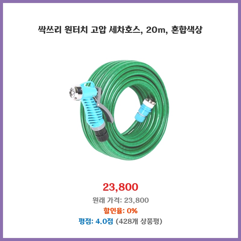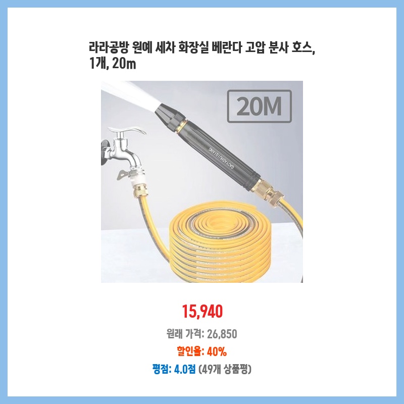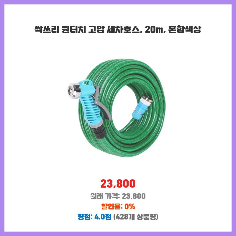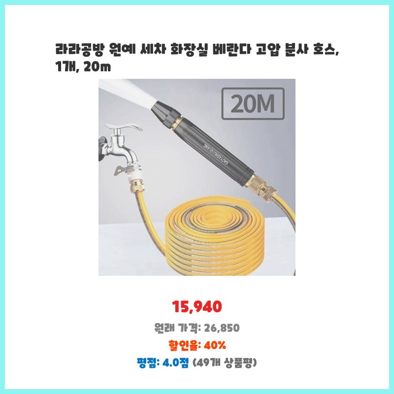 세차, 화분 물주기, 베란다 청소 등 다용도로 활용 가능한 고압 분사 호스가 필요해서 구매했습니다. 20m 길이로 넉넉하고, 수압 조절도 편리해서 좋습니다. 가격도 저렴한 편이라 만족합니다.