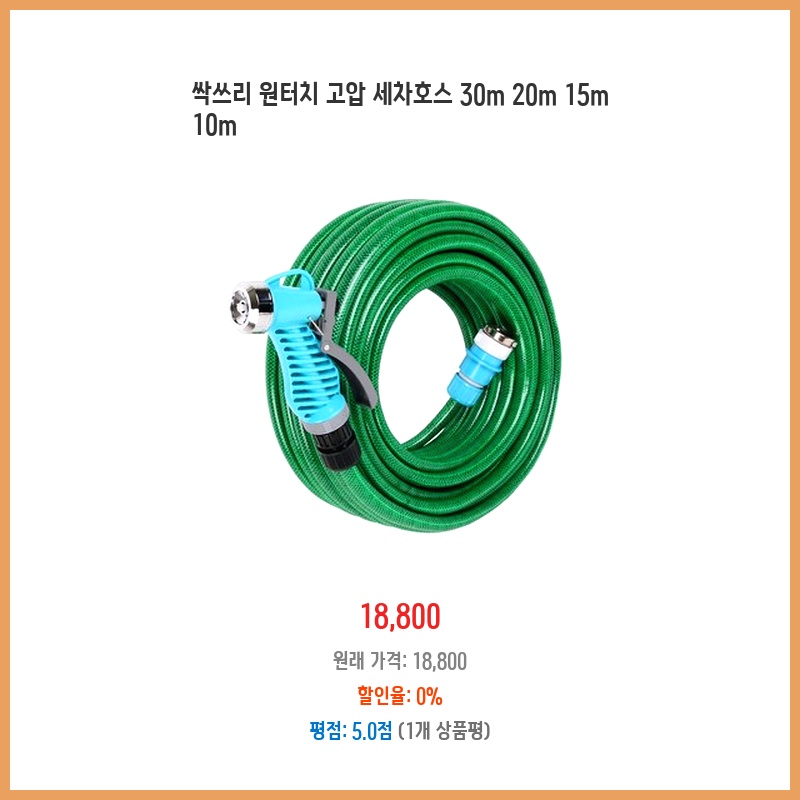 수압 짱짱해서 세차가 훨씬 쉬워졌어요! 20m 길이도 넉넉하고 색깔도 예뻐서 만족합니다.
