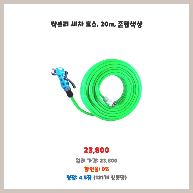기존 호스가 짧고 잘 꼬여서 싹쓰리 세차 호스(20m) 구매했습니다. 길이가 길어 세차하기 편하고, 꼬임 방지 기능 덕분에 수압 저하 없이 사용 가능합니다. 가볍고 내구성도 좋아 보여 오래 쓸 수 있을 것 같아 만족합니다.