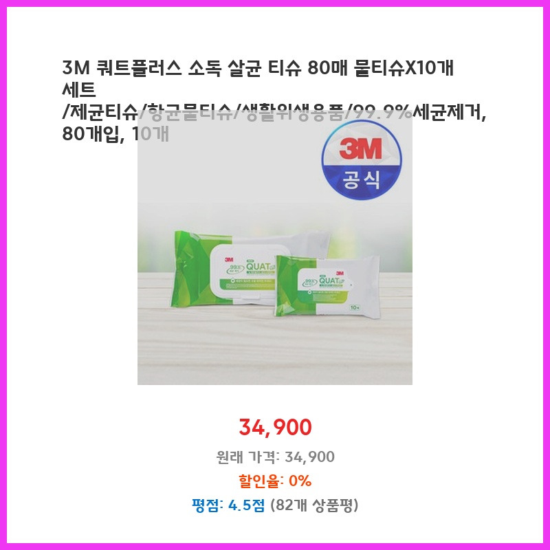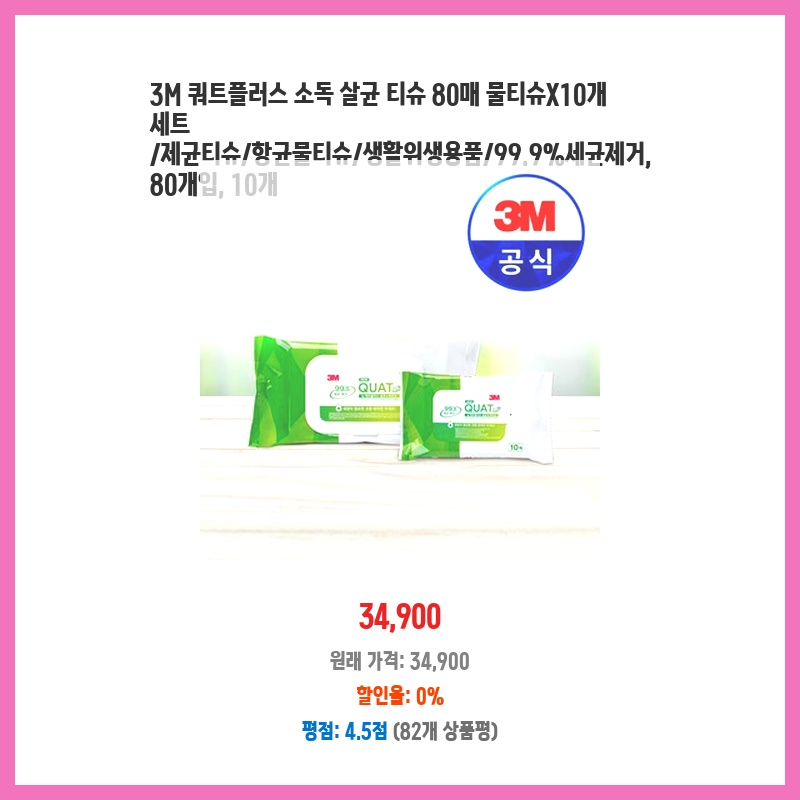 3M 브랜드라 믿고 구매했어요. 99.9 살균력으로 아이 장난감, 주방, 화장실 등 다용도로 사용 가능해서 편리하고 위생적이에요. 80매 대용량에 10개 세트 구성이라 오래 쓸 수 있고, 개별 포장으로 휴대도 간편합니다.