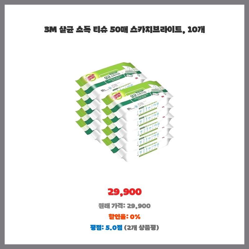 잦은 외출 후 아이 장난감, 핸드폰 등을 간편하게 소독하기 위해 3M 살균 소독 티슈를 구매했습니다. 넉넉한 50매입 10개 구성으로 가성비가 좋고, 스카치브라이트 제품이라 믿을 수 있어 안심하고 사용 가능합니다. 휴대도 편리해서 위생 관리에 효과적입니다.