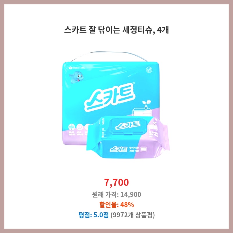 스카트 세정티슈는 먼지 제거력이 좋고 닦은 후 잔여물이 남지 않아 만족스럽게 사용해왔습니다. 4개 묶음 상품으로 구매하여 가격도 저렴해서 재구매했습니다. 두꺼워서 여러 번 접어 쓸 수 있고, 물티슈처럼 쉽게 찢어지지 않아 편리합니다.