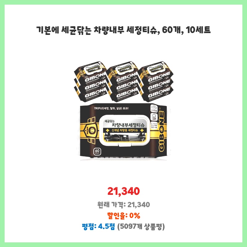 차량 내부 먼지, 얼룩 제거에 딱! 향도 은은하고 세정력도 좋아서 만족해요. 60매 대용량에 10세트라 오래 쓸 수 있어서 더 좋네요.