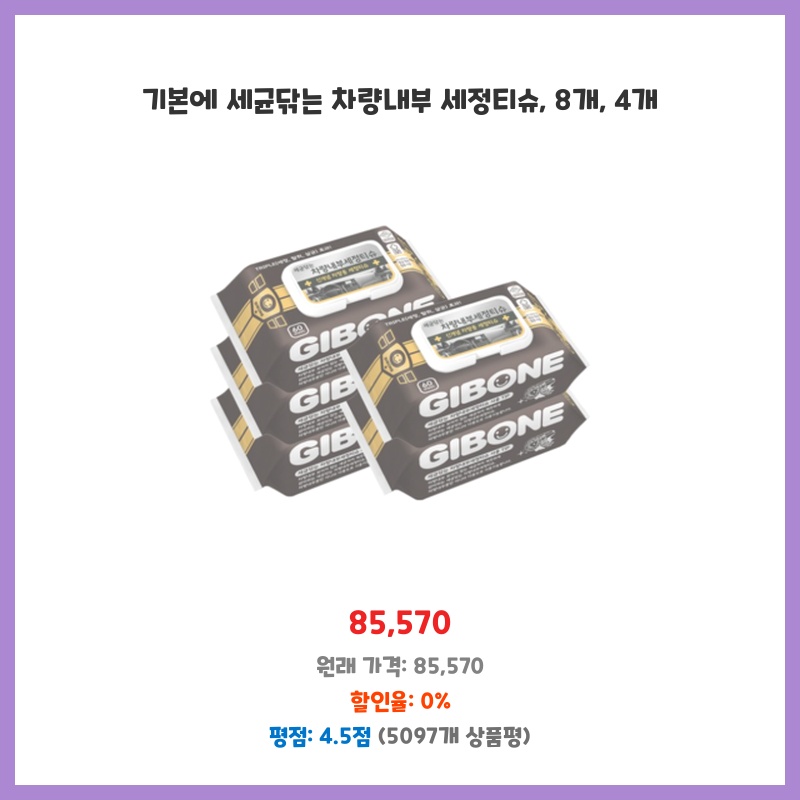 차량 내부 청결 유지에 신경쓰는 편이라 구매했습니다. 세균 제거 기능이 있다는 점과 티슈 타입이라 간편하게 사용할 수 있을 것 같아서 선택했습니다. 대용량 구성으로 가격적인 메리트도 있어 보였습니다.