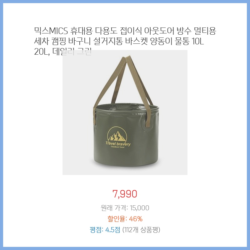 믹스MICS 바구니는 캠핑과 차 세척에 완벽해요. 방수 기능이 뛰어나서 물이 새지 않고, 접이식이라 휴대가 간편해요. 10L와 20L 용량으로 필요에 따라 선택할 수 있어서 편리하죠.
