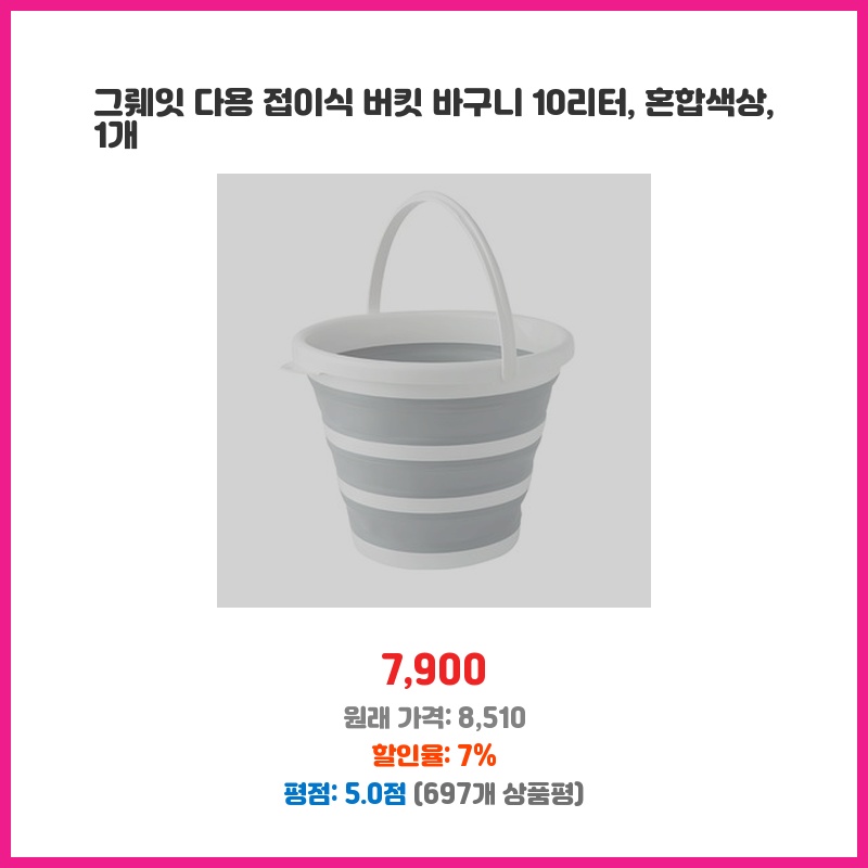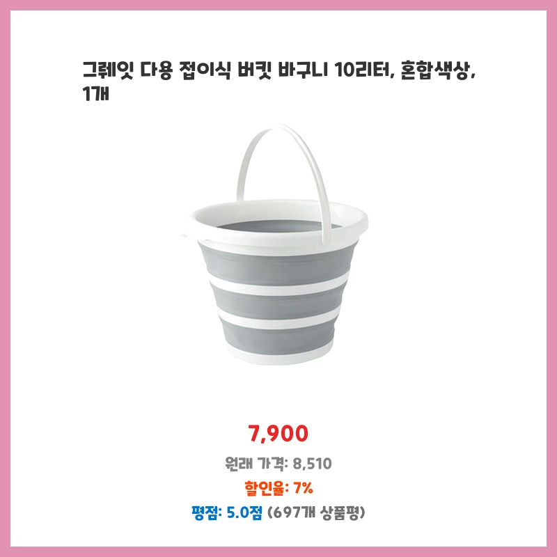 그뤠잇 버킷은 접이식 기능 덕분에 보관이 쉽고, 10리터 용량으로 여러 용도에 적합합니다. 튼튼한 소재로 만들어져 있어 수송이나 보관 중 물건이 쏟아지는 것을 방지해줍니다.