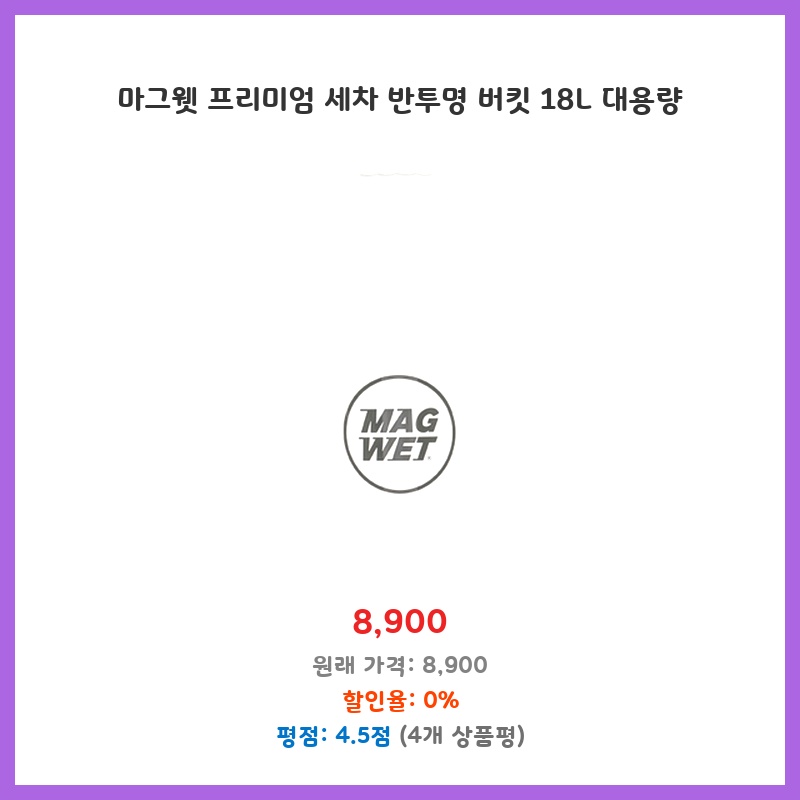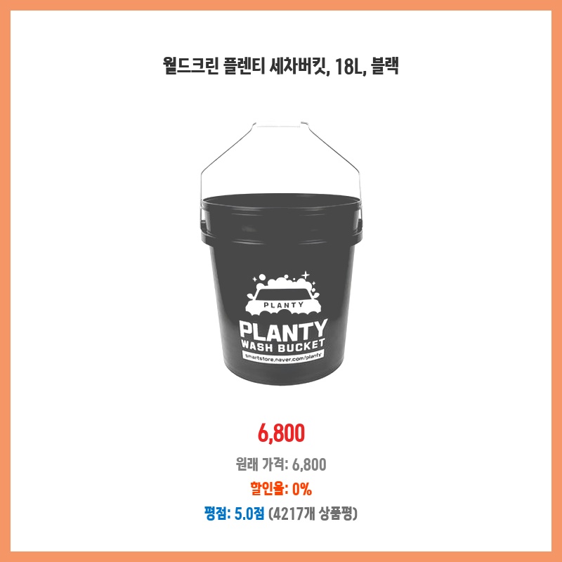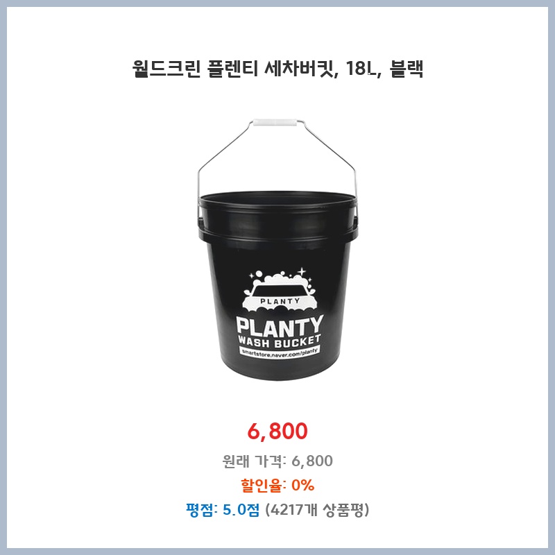 세차 버킷 용량이 커서(18L) 여러 번 물을 갈 필요 없어 편리합니다. 검정색이라 때도 덜 타 보이고, 가격도 저렴한 편(6,800원)이라 부담 없이 구매했습니다. 튼튼한 재질로 오래 사용할 수 있을 것 같아 만족합니다.