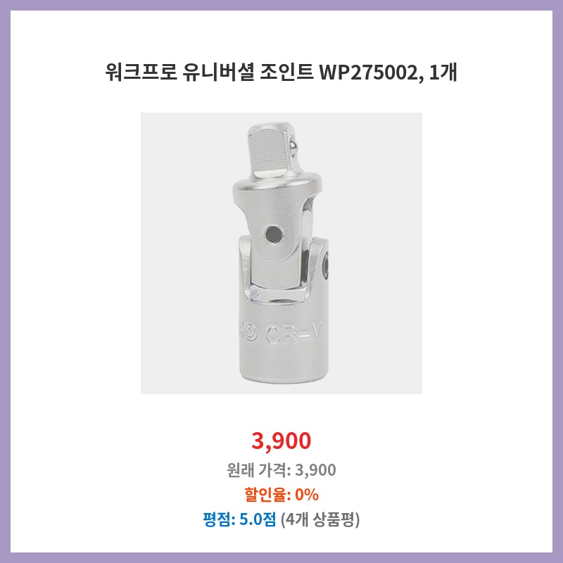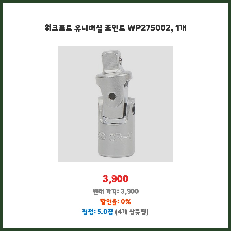 기존 임팩트 렌치 소켓 연결부가 마모되어 교체용으로 구매했습니다. 워크프로 유니버셜 조인트 WP275002는 견고한 내구성과 정확한 체결력을 제공한다는 평이 많아 선택했습니다. 3,900원의 저렴한 가격도 구매 결정에 큰 영향을 주었습니다.