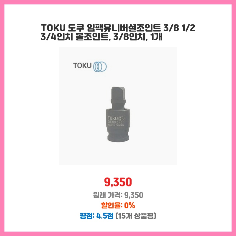 좁은 공간에서 작업할 때 필수! TOKU 임팩유니버셜조인트는 볼조인트 방식이라 각도 조절이 자유로워 편리합니다. 38인치 사이즈가 필요해서 구매했고, 견고한 내구성도 기대됩니다.