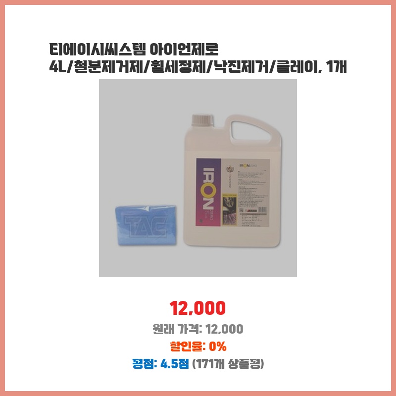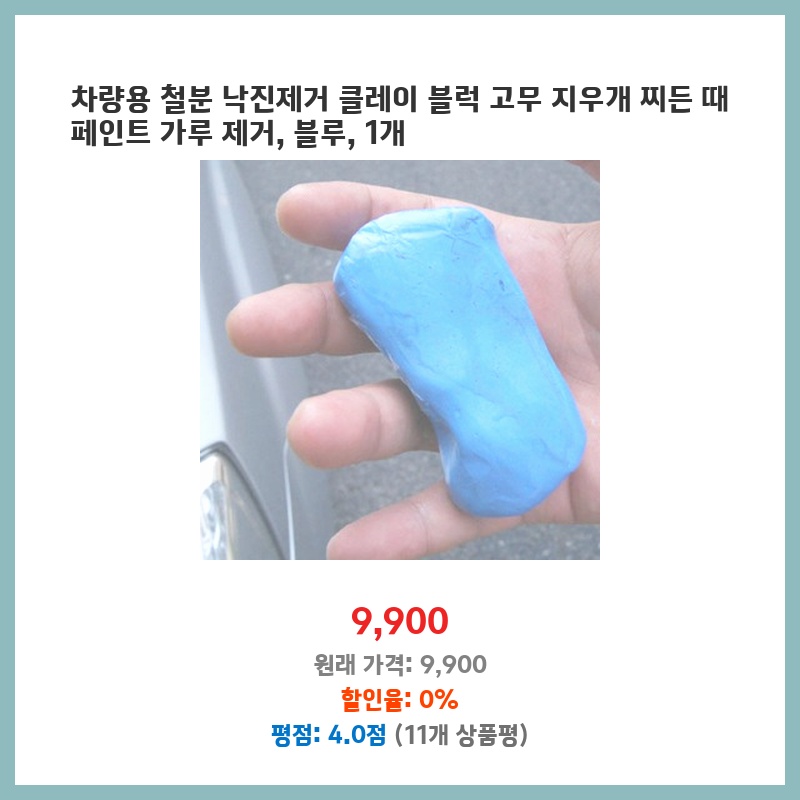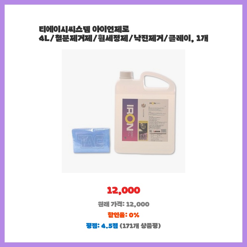 세차 후에도 남는 까칠한 철분, 낙진 때문에 구매했습니다. 도장면에 손상 없이 깔끔하게 제거되어 만족스럽습니다. 가격도 저렴하고 사용법도 간편해서 좋네요. 차량 관리 필수템으로 추천합니다.