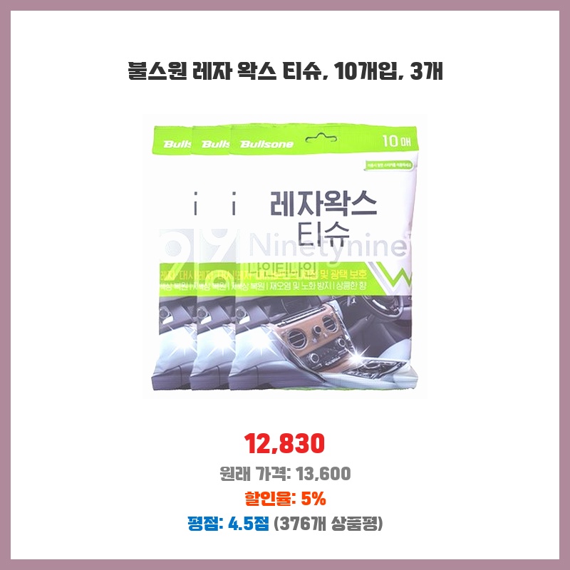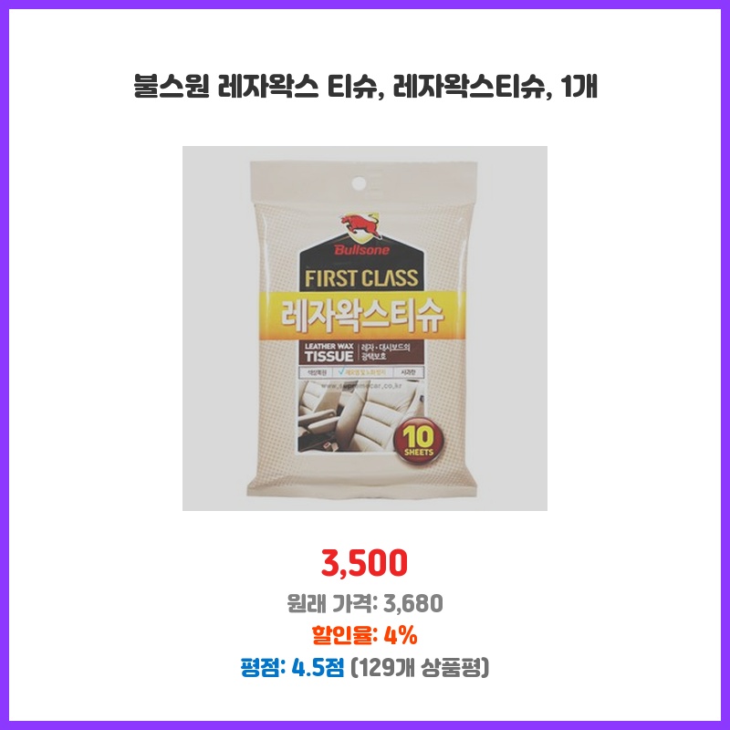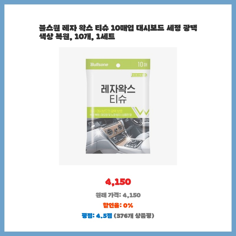 차량 내부 가죽 시트 및 대시보드 관리를 위해 구매. 티슈 타입이라 사용 편리하고, 레자 왁스 성분으로 세정과 동시에 광택 및 색상 복원 효과 기대. 10매씩 개별 포장되어 휴대 및 보관 용이하고, 가격도 부담 없어 정기적인 차량 관리에 적합.